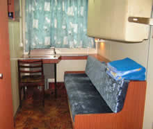 В каюте: шкаф для одежды, видеодвойка, холодильник, радио, кондиционер, душ, умывальник, туалет. В однокомнатных каютах (№№ 47-50) мягкая мебель.